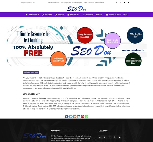 Are you in search of SEO submission large database for free? Do you know how much benefit is derived from high domain authority submission list? If not, we are here to help you with all your unanswered questions. SEO Don has been initiated with the purpose of helping digital marketers and SEO analysts to increase their web presence with the help of our high quality submission sites. By taking assistance of our SEO ‘On Page’ technique and ‘Off Page’ submission sites, you can increase organic traffic on your website. You can also beat your competitors by using our submission sites with high quality backlinks.